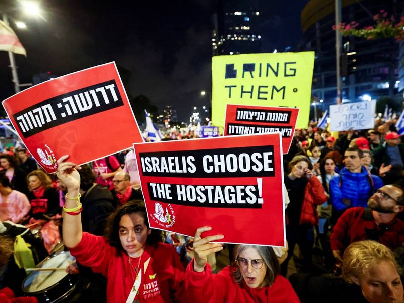 صدها معترض هم با برپایی تجمعی در اورشلیم، خواهان آزادی گروگانهای در بند حماس شدند و به سوی خانه نتانیاهو در این شهر راهپیمایی کردند.