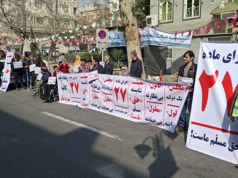 جمعی از افراد دارای معلولیت در پی به نتیجه نرسیدن ماهها مکاتبه به منظور رسیدگی به مطالباتشان، چهارشنبه ۲۲ اسفند مقابل ساختمان نهاد ریاستجمهوری در تهران تجمع کردند.