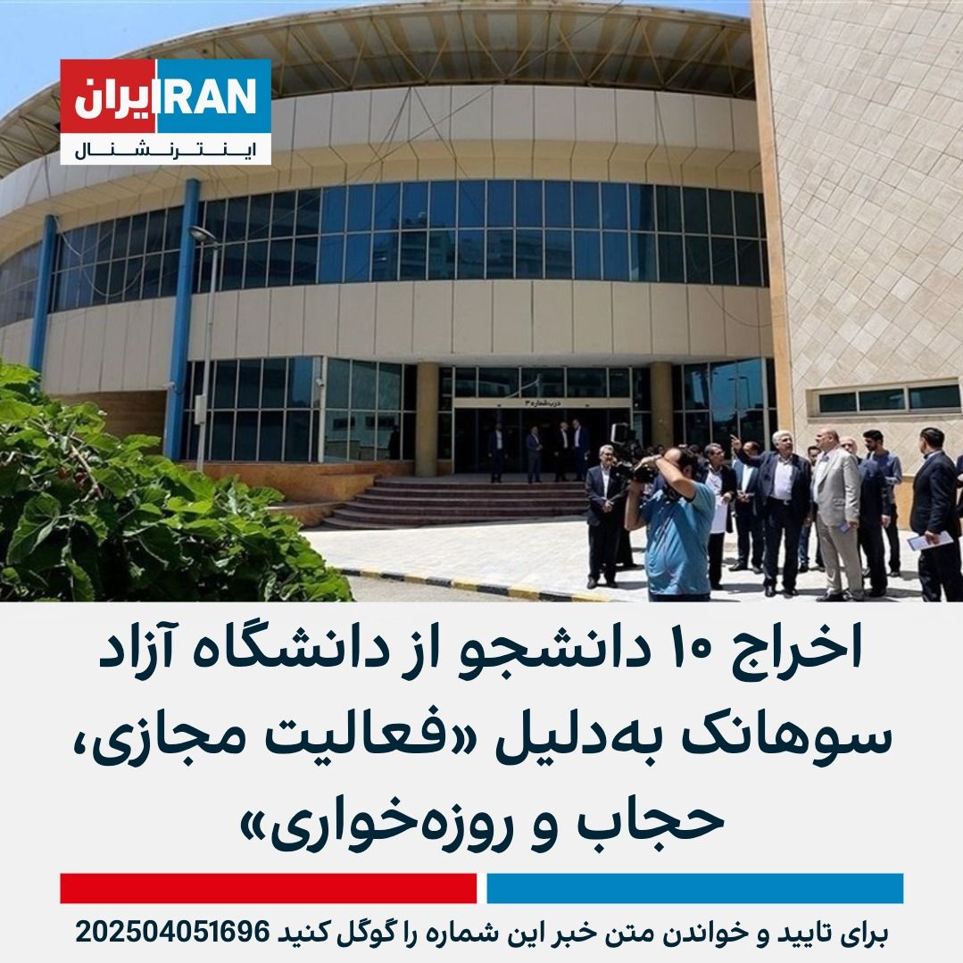 بر اساس اطلاعات رسیده به ایراناینترنشنال، حکم اخراج دستکم ۱۰ دانشجوی دانشگاه آزاد واحد سوهانک صادر شده است. این دانشجویان به دلایلی همچون اظهارنظرهای انتقادی در فضای مجازی، نافرمانی در برابر حجاب اجباری و خوردن و آشامیدن در ماه رمضان، از تحصیل محروم شدهاند.