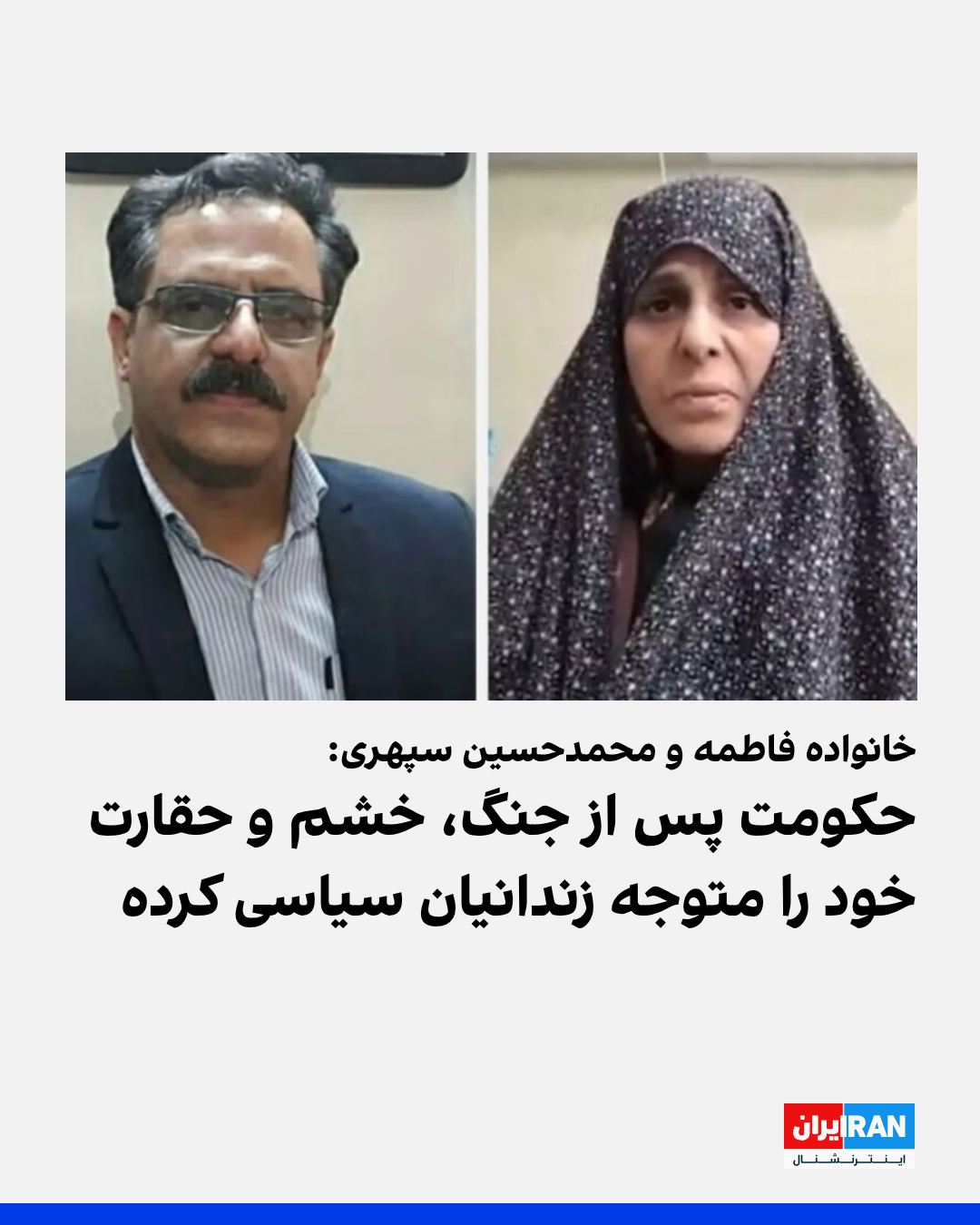 خانواده فاطمه و محمدحسین سپهری، زندانیان سیاسی در بیانیهای با اشاره به ضربات وارد شده به جمهوری اسلامی در جنگ ۱۲ روزه و «خشم و حقارت تحمیل شده»، اعلام کردند رژیم جمهوری اسلامی در تازهترین اقدام، تحقیر و تعرض جسمی و جنسی را متوجه خانوادههای زندانیان سیاسی کرده است.