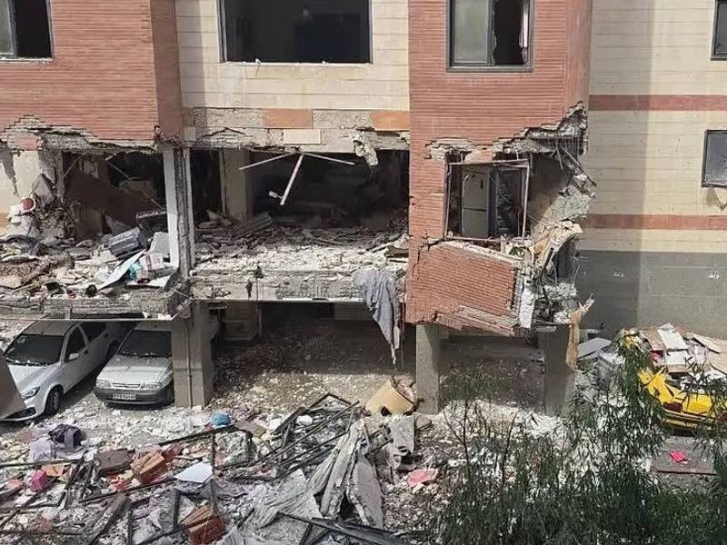در قم، یکی از ساختمانها طوری آسیب دیده بود که گویی بمبی در آن منفجر شده است؛ دیوارهای واحد طبقه اول فرو ریخت و شیشههایش شکست. تاکسی زردرنگی که در خیابان پارک شده بود هم زیر آوار له شد.