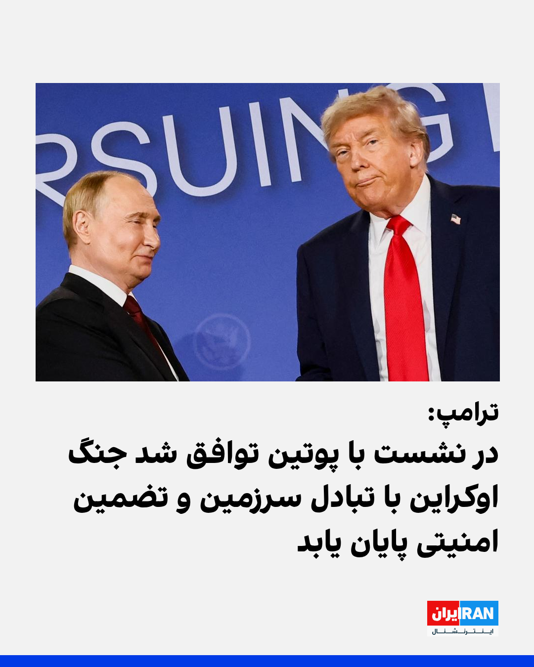 دونالد ترامپ، رئیسجمهوری ایالات متحده، جمعه در گفتوگو با شبکه فاکس نیوز اعلام کرد که در دیدارش با ولادیمیر پوتین، رئیسجمهوری روسیه، توافق کردند که جنگ اوکراین در نهایت با «مبادله سرزمینها» و نوعی تضمین امنیتی از سوی آمریکا به پایان خواهد رسید.