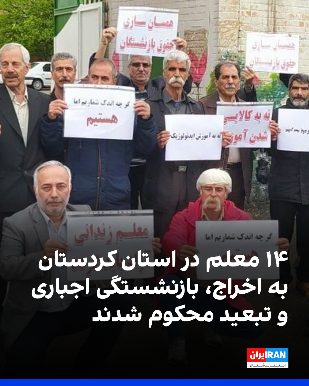در ادامه برخوردهای امنیتی با فعالان صنفی معلمان در ایران، تشکلهای صنفی معلمان از صدور احکام سنگین علیه ۱۴ معلم در استان کُردستان گزارش داد. اخراج دائم، بازنشستگی اجباری، انفصال موقت از خدمت، تبعید و محرومیتهای شغلی از جمله احکام صادره علیه این فرهنگیان است.