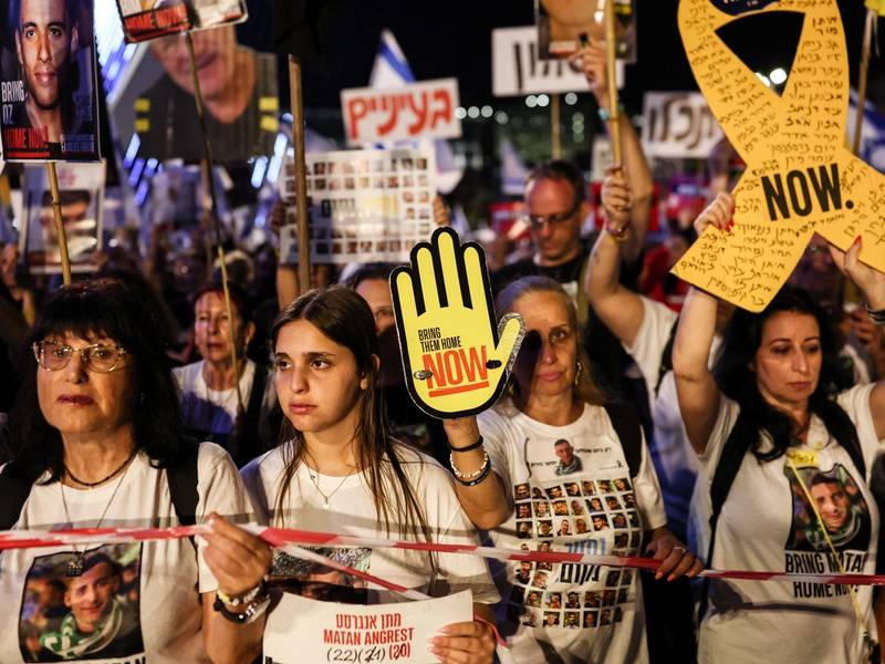 بر اساس نظرسنجیها، اکثریت اسرائیلیها اکنون خواستار مذاکره برای آتشبس دائمی با حماس هستند. معترضان در تلآویو تاکید کردند: «این جنگ هیچ هدفی ندارد جز خشونت و مرگ.» حماس گفته در صورت پایان جنگ و خروج نیروهای اسرائیلی از غزه، حاضر است همه گروگانها را آزاد کند، اما نتانیاهو بر آزادی همزمان تمام گروگانها و تسلیم کامل حماس اصرار دارد.
