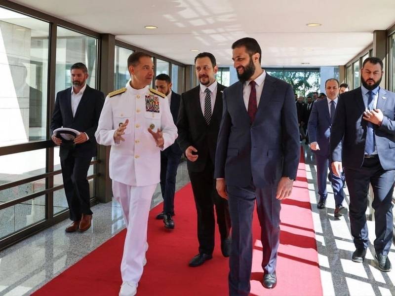 دریادار براد کوپر، فرمانده ستاد فرماندهی مرکزی ایالات متحده (سنتکام) و توماس باراک، سفیر و فرستاده ویژه ایالات متحده برای سوریه، با احمد الشرع رییسجمهوری موقت سوریه، در کاخ ریاست جمهوری این کشور در دمشق دیدار کردند.