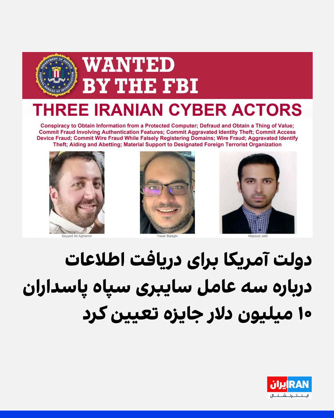 وزارت امور خارجه آمریکا برای دریافت اطلاعات درباره سه عامل سایبری وابسته به سپاه پاسداران به نامهای علی آقامیری، یاسر بلاغی و مسعود جلیلی، ۱۰ میلیون دلار جایزه تعیین کرد.