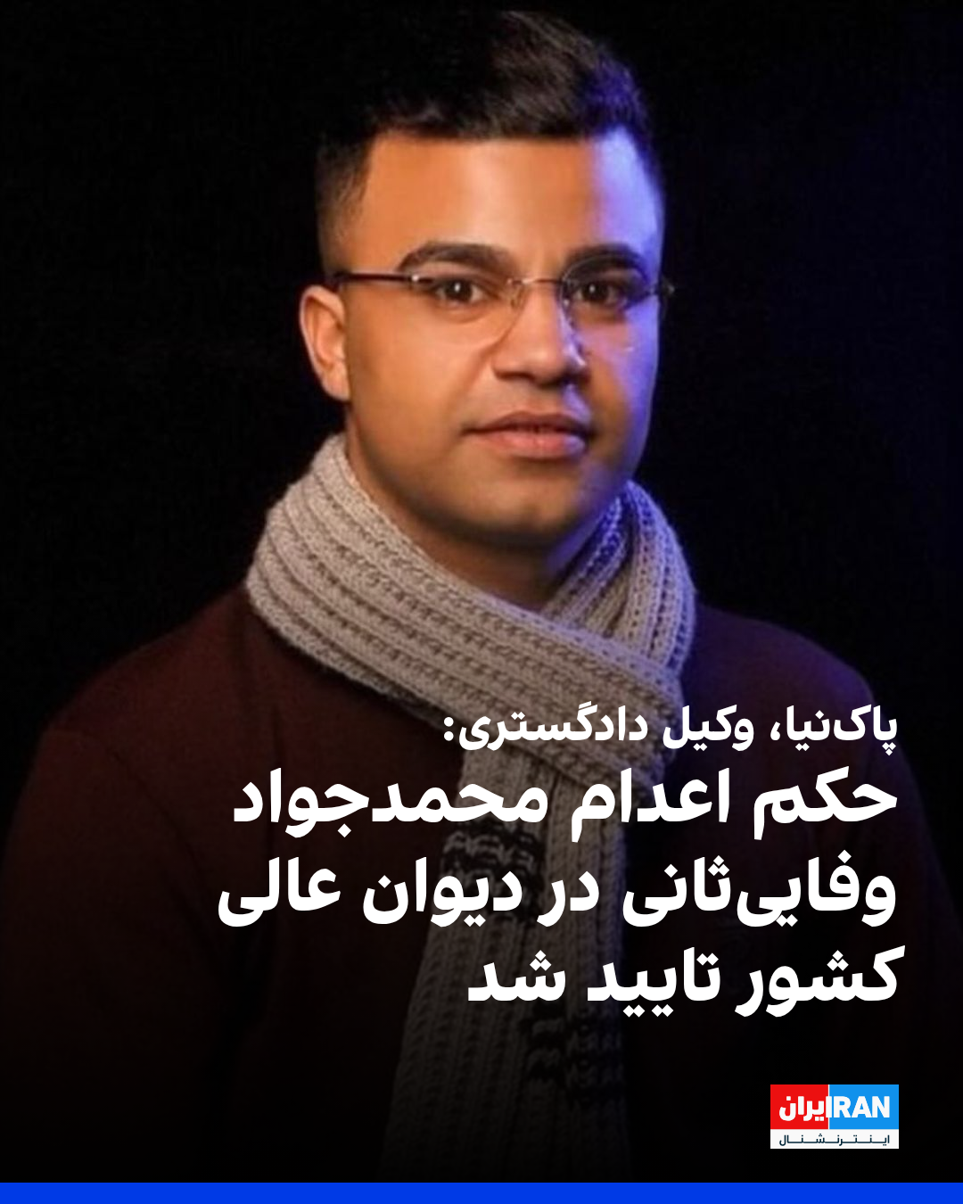بابک پاکنیا، وکیل محمدجواد وفایی ثانی، از معترضان آبان ۹۸، خبر داد حکم اعدام او با وجود «ایرادات فراوان» در شعبه نهم دیوان عالی کشور تایید شده است.