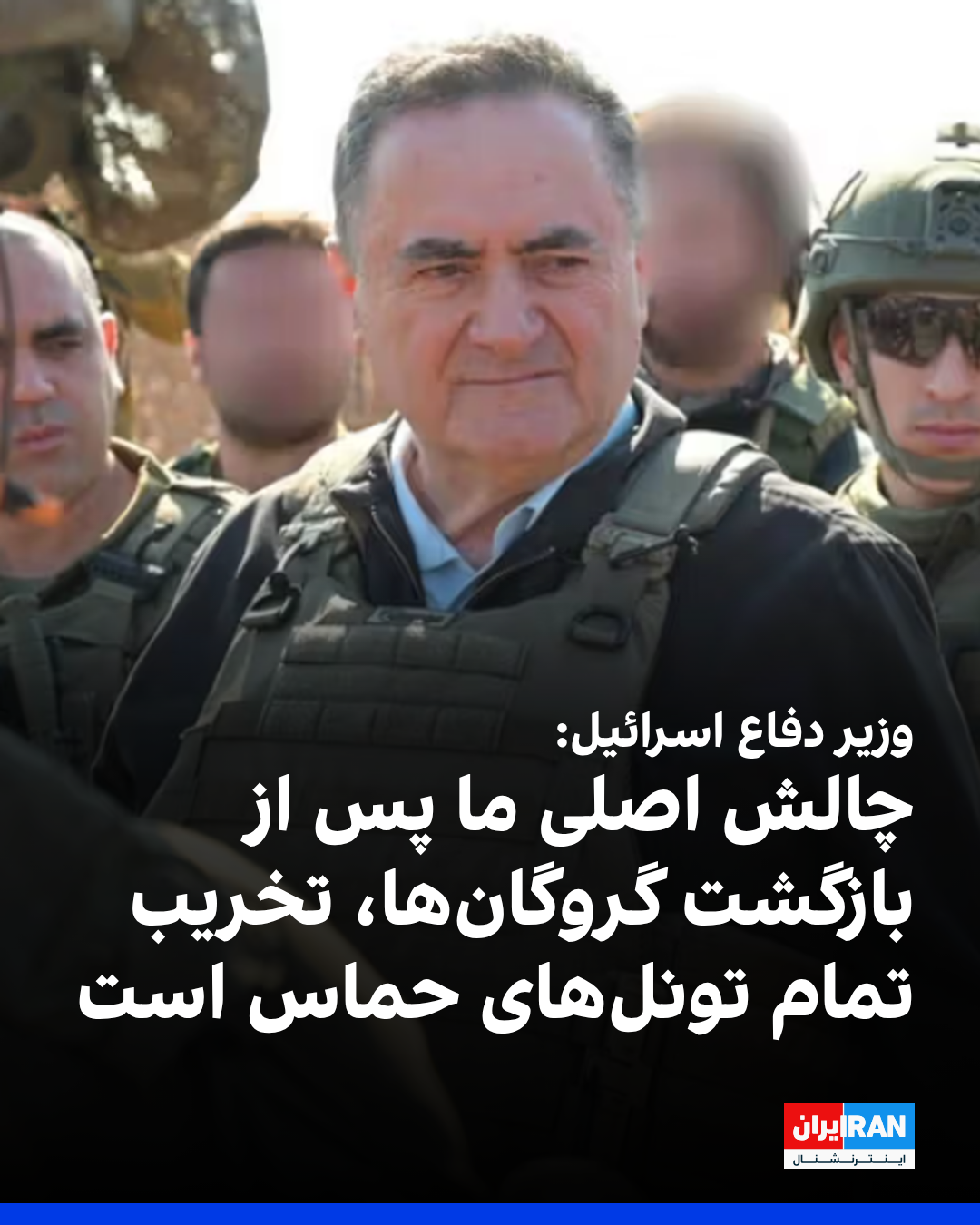 وزیر دفاع اسرائیل در حساب ایکس خود نوشت که چالش اصلی اسرائیل پس از بازگشت گروگانها، تخریب تمام تونلهای حماس توسط ارتش اسرائیل و از طریق سازوکار بینالمللی تحت رهبری و نظارت آمریکا، خواهد بود.