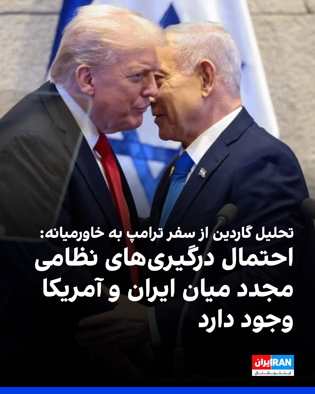 گاردین در تحلیلی درباره سفر ترامپ به خاورمیانه و سخنان او در پارلمان اسرائیل نوشت: «تحلیلگران میگویند پس از حملات آمریکا به تاسیسات هستهای ایران و کشته شدن قاسم سلیمانی، بیاعتمادی تهران نسبت به واشینگتن در بالاترین سطح قرار دارد و احتمال از سرگیری درگیریهای نظامی وجود دارد.»