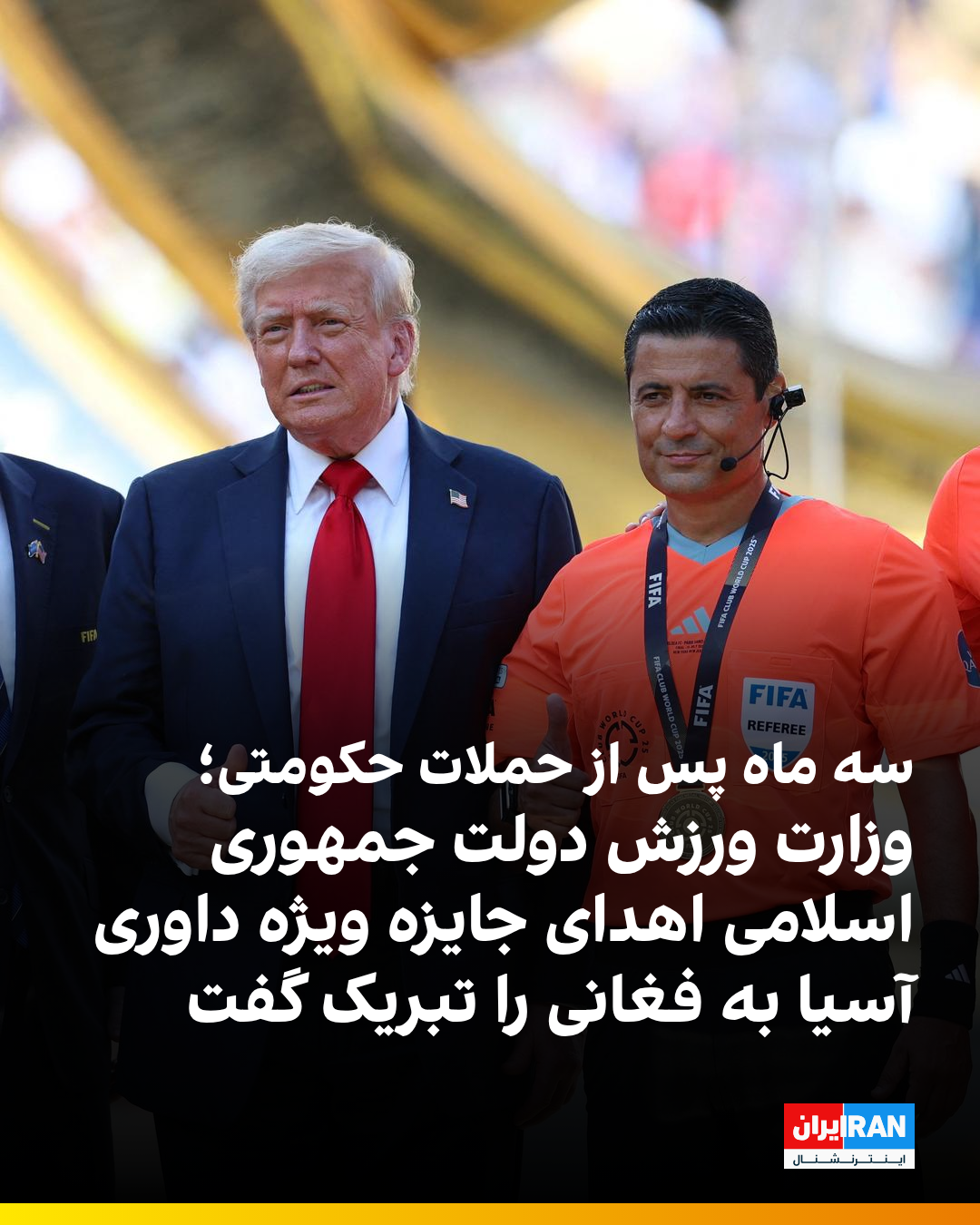 سه ماه پس از حملات زنجیرهای رسانهها و نهادهای حکومتی به علیرضا فغانی، داور بینالمللی ایرانی، برای دریافت مدال از دونالد ترامپ، رییسجمهور آمریکا، وزارت ورزش و جوانان ایران به فغانی بابت کسب جایزه ویژه داوری سال ۲۰۲۵ آسیا، تبریک گفت.