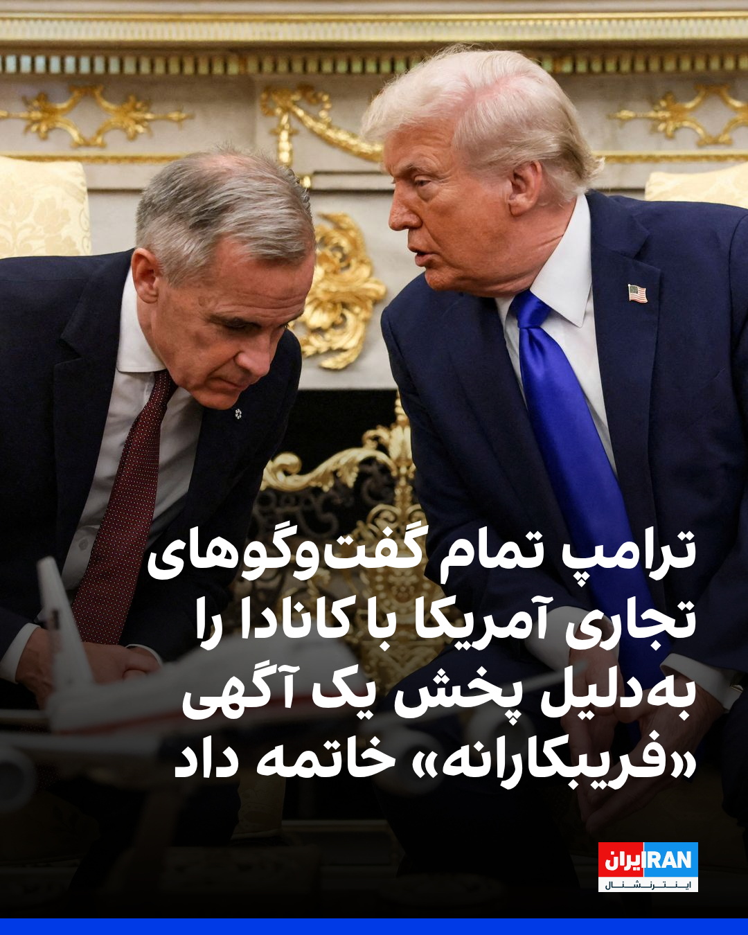 دونالد ترامپ، رییسجمهوری آمریکا، اعلام کرد تمام مذاکرات تجاری با کانادا را بهدلیل انتشار یک آگهی تلویزیونی «فریبکارانه» که در آن رونالد ریگان، از روسای جمهوری پیشین ایالات متحده، علیه تعرفهها سخن میگوید، متوقف کرده است.