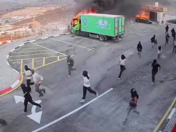 در این تصاویر، دهها شهرکنشین، برخی با ماسک و برخی با چوب و باتوم، در حال به آتش کشیدن کامیونها و خودروهای پارکشده در محوطه دیده میشوند.
