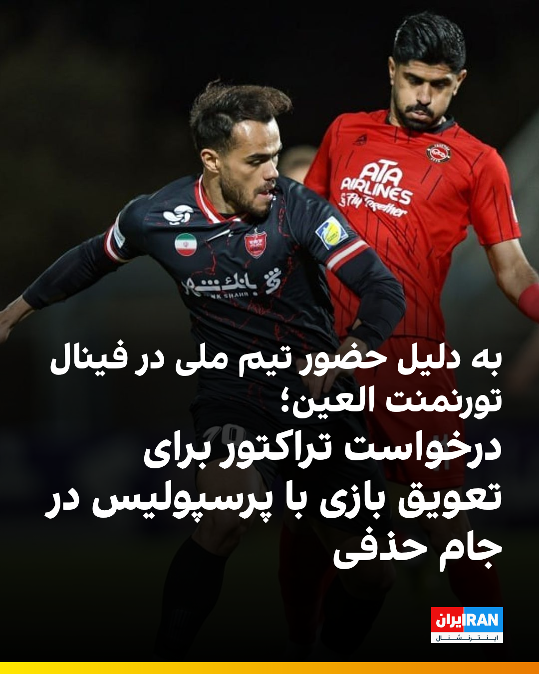 ایسنا خبر داده باشگاه تراکتور به دلیل حضور تیم ملی در فینال تورنمنت امارات که ۲۷ آبان ۱۴۰۴ برگزار میشود و فاصله سهروزه تا بازی در جام حذفی با پرسپولیس در تاریخ ۳۰ آبان ۱۴۰۴، درخواست تعویق این دیدار را داده است. قرار است سازمان لیگ فردا درخواست باشگاه تراکتور را بررسی کند.