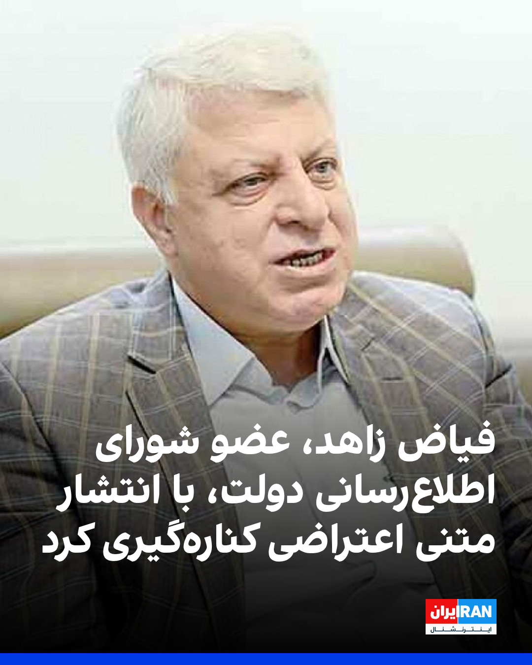 فیاض زاهد، عضو شورای اطلاعرسانی دولت جمهوری اسلامی، استعفا کرد و الیاس حضرتی، رییس این شورا، تقاضای کنارهگیری او را مورد موافقت قرار داد.