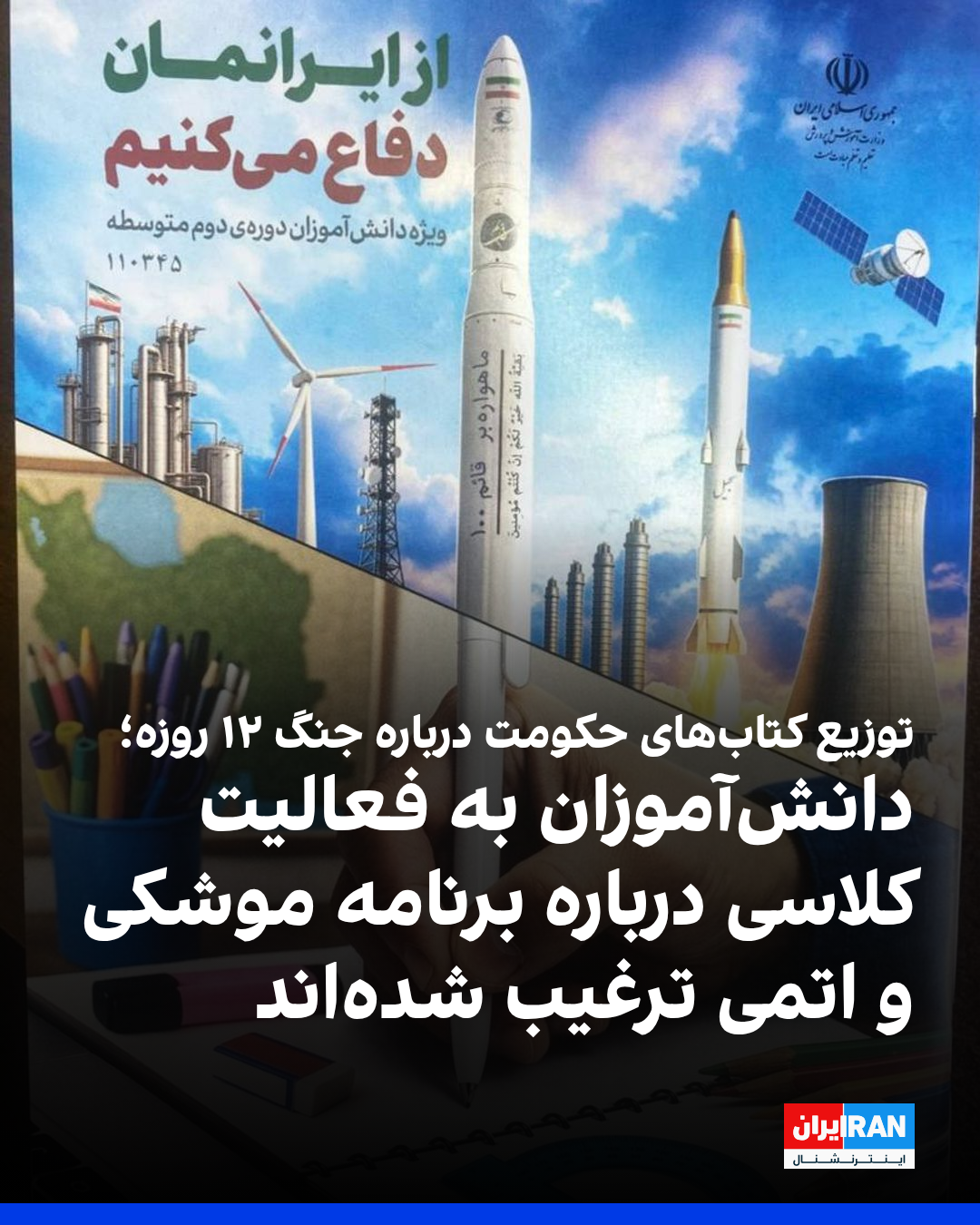 بررسی ایراناینترنشنال از محتوای کتابهای توزیعشده در مدارس ایران در رابطه با جنگ ۱۲ روزه نشان میدهد مقامهای حکومت دانشآموزان را به فعالیت مدرسهای در حمایت از برنامه اتمی و موشکی، غنیسازی در داخل کشور و فیلمنامهنویسی درباره حمله سایبری به اسرائیل ترغیب کردهاند.
