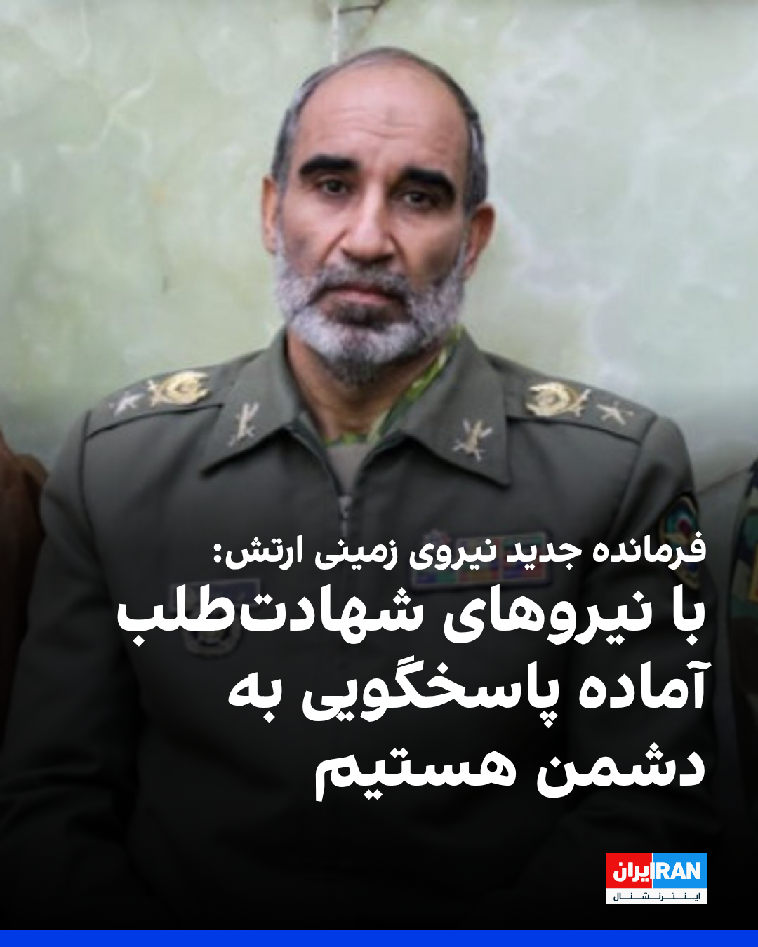 علی جهانشاهی، فرمانده جدید نیروی زمینی ارتش جمهوری اسلامی گفت: «با داشتن نیروی انسانی کارآمد، مومن و شهادتطلب، تسلیحات و تجهیزات بهروز و استفاده از تجارب پیشکسوتان و جنگ ۱۲ روزه، آماده پاسخگویی به هرگونه تهدید احتمالی دشمنان هستیم.»