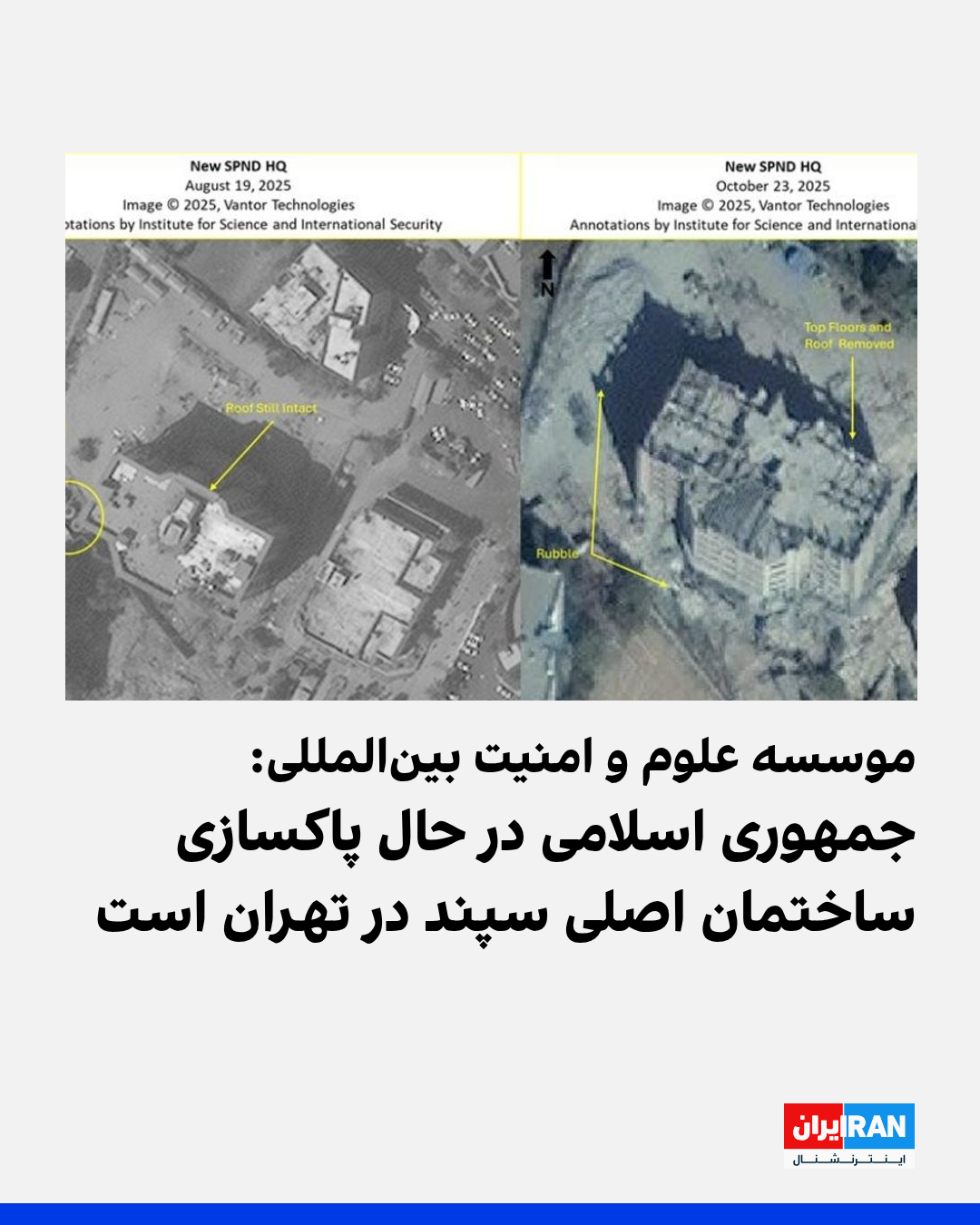 این موسسه بر اساس تصاویر ماهوارهای شرکت ونتور در فاصله بین ۲۸ مرداد تا اول آبان نوشت که ایران در حال تخریب این ساختمان است، سقف و طبقات بالایی ساختمان برداشته شده و تودههای بزرگی از آوار اطراف ساختمان را فرا گرفته است.
