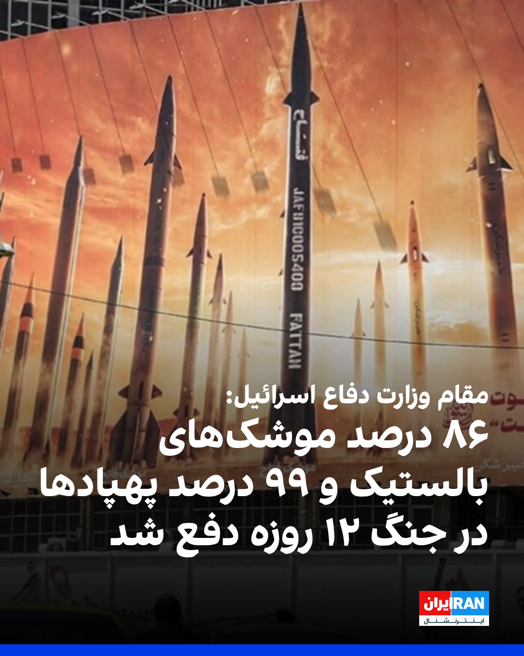 یک مقام وزارت دفاع اسرائیل گفت این کشور در رهگیری موشکهای بالستیک در جنگ ۱۲ روزه بیش از ۸۶ درصد، و در دفع پهپادها ۹۹ درصد موفقیت داشت.