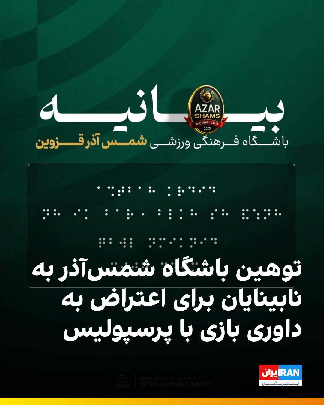 باشگاه شمسآذر قزوین در اعتراض به داوری بازی با پرسپولیس، پوستری را به عنوان بیانیه اعتراضی منتشر کرد که در آن طرحی با شکل و شمایل خط بریل دیده میشود.