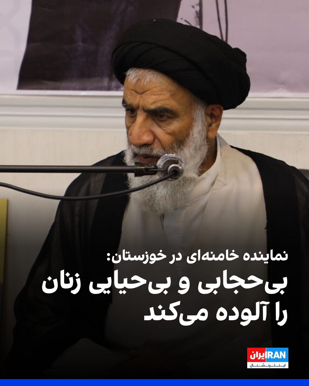 محمدنبی موسویفرد، نماینده خامنهای در خوزستان گفت: «گسترش بیحجابی و بیحیایی، زنان را آلوده میکند و اگر زن آلوده شود، قطعا خانواده و جامعه آلوده خواهد شد.»