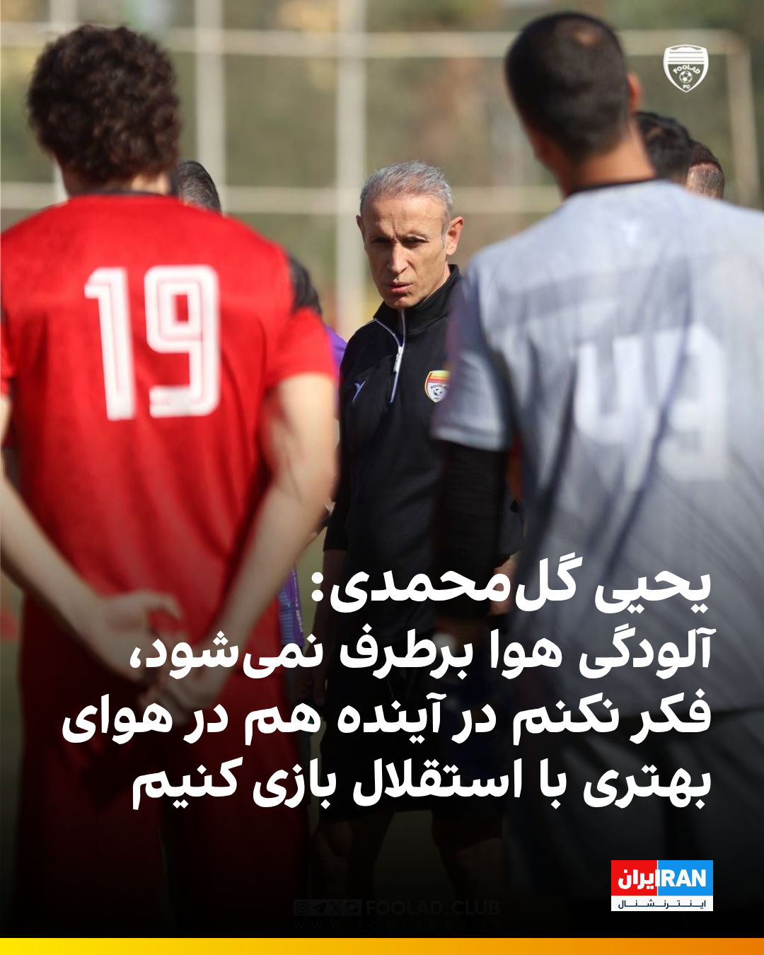 یحیی گلمحمدی، سرمربی تیم فولاد خوزستان، در نشست خبری پیش از بازی با استقلال درباره احتمال لغو این بازی بهدلیل آلودگی هوای تهران گفت: «به نظر من این مشکل ادامهدار است، چون هنوز آنچنان هوا سرد نشده است، فکر نمیکنم در آینده نیز شرایطی پیش بیاید که در هوایی بهتر بازی کنیم.»