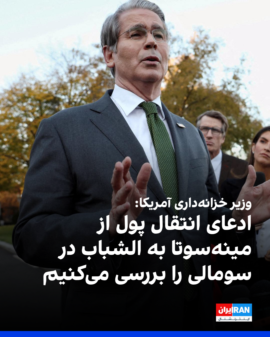 وزیر خزانهداری آمریکا در رسانه اجتماعی ایکس نوشت: «بهدستور من، وزارت خزانهداری آمریکا در حال تحقیق درباره این ادعاست که تحت مدیریت ناکارآمد دولت بایدن و فرماندار تیم والز، ممکن است دلارهای مالیاتی شهروندان سختکوش مینهسوتا به سازمان تروریستی الشباب منتقل شده باشد.»