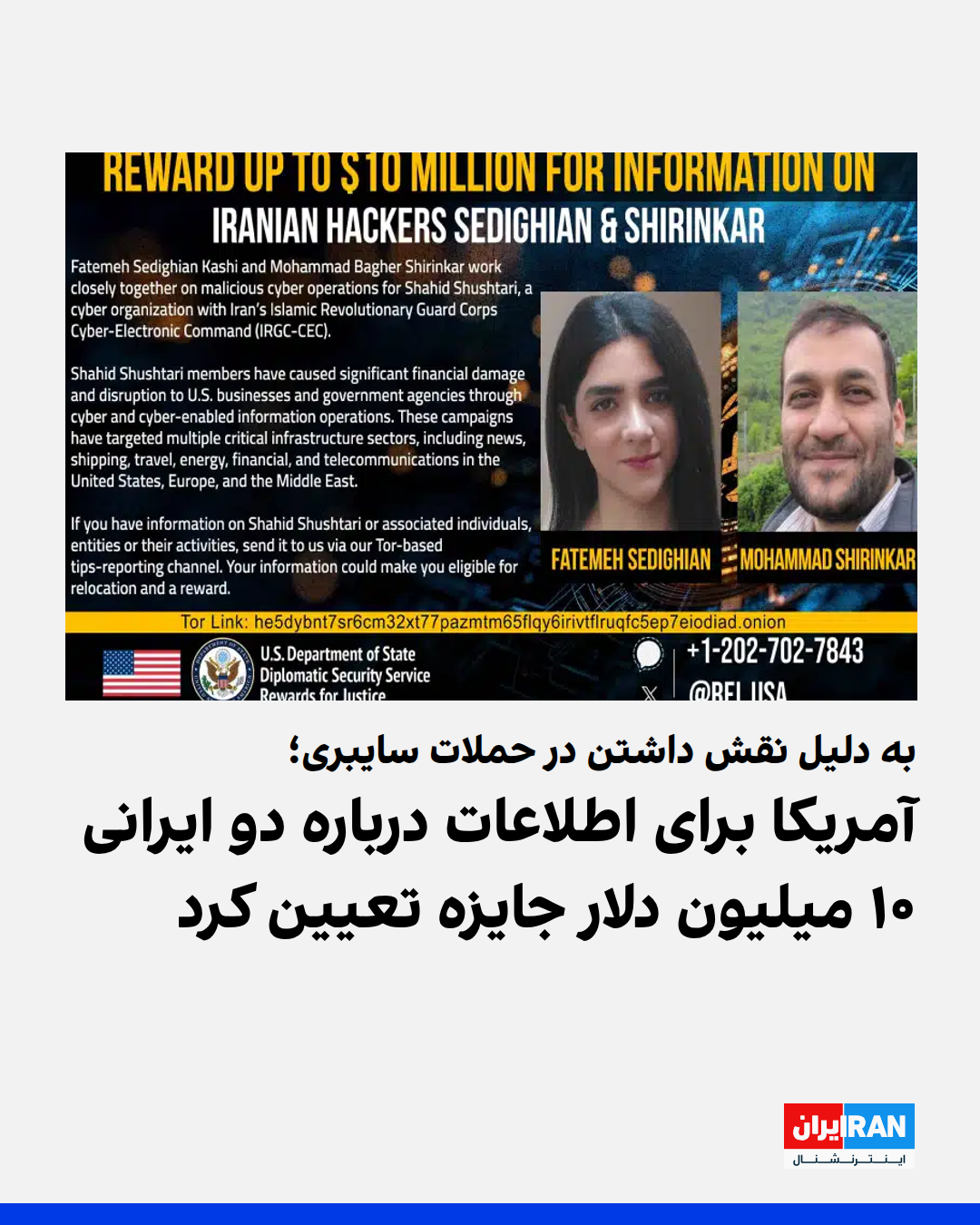 برنامه «پاداش برای عدالت» وزارت خارجه آمریکا جایزهای تا سقف ۱۰ میلیون دلار برای ارائه اطلاعات بهمنظور شناسایی و مکانیابی دو ایرانی تعیین کرد که تحت «هدایت دولت خارجی و با نقض قانون کلاهبرداری و سوءاستفاده رایانهای» عملیات حمله سایبری علیه زیرساختهای آمریکا انجام دادهاند.