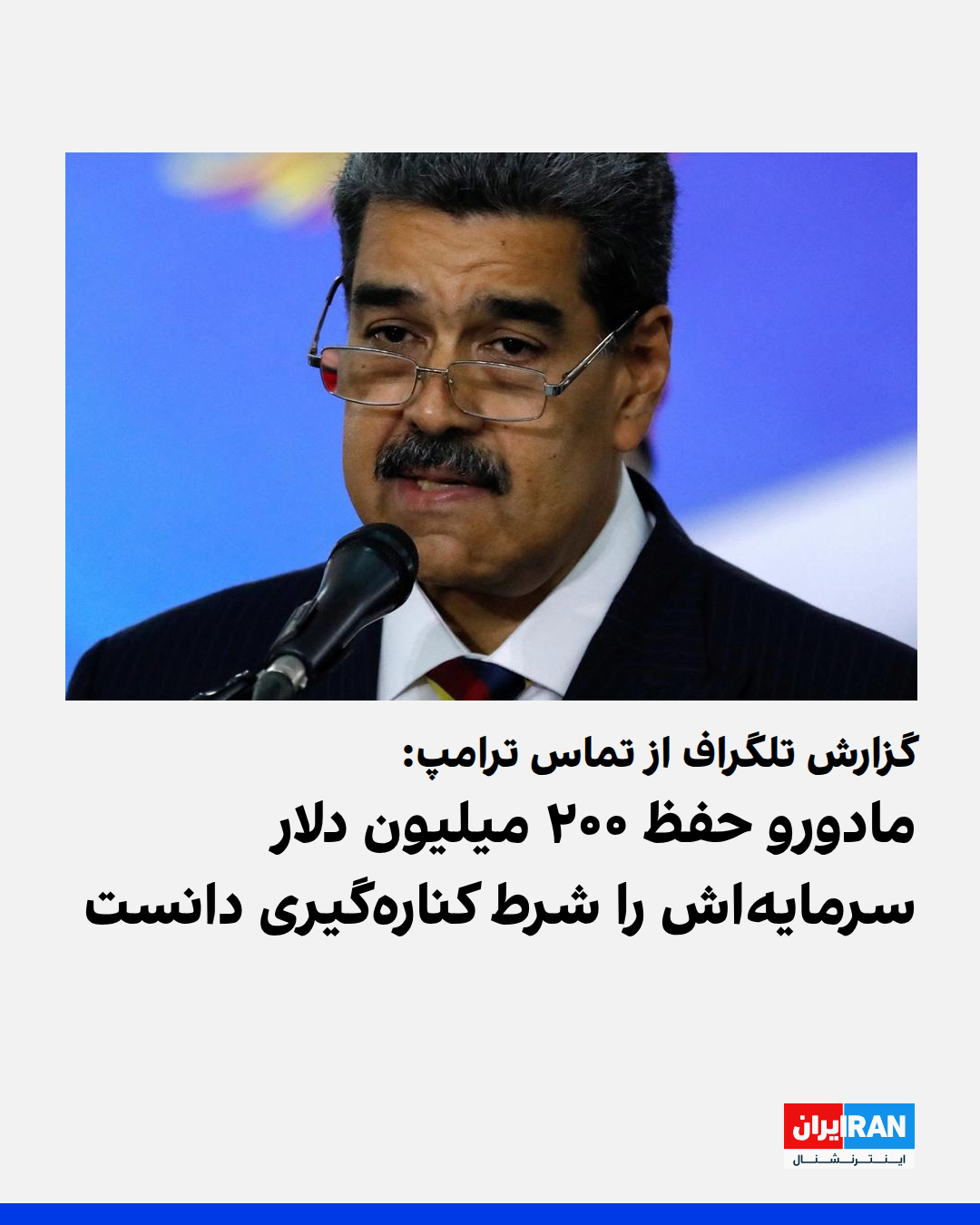 نشریه تلگراف گزارش داد نیکلاس مادورو، رییسجمهوری ونزوئلا، در گفتوگوی تلفنی اخیر با دونالد ترامپ، همتای آمریکایی خود، درخواست کرد در ازای تسلیم شدن و خروج از کشور، از «۲۰۰ میلیون دلار دارایی شخصیاش» محافظت شود و برای مقامهای ارشد حکومت ونزوئلا «عفو کامل» در نظر گرفته شود.