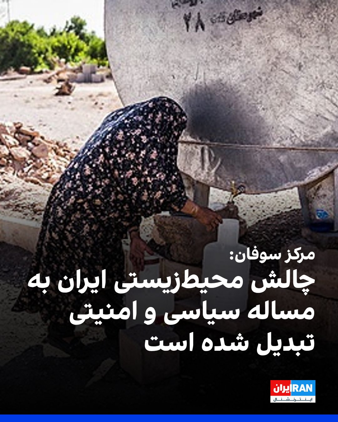 مرکز سوفان هشدار داده است بحران آب در ایران از یک چالش محیطزیستی فراتر رفته و به مسألهای جدی سیاسی و امنیتی تبدیل شده است. تحلیلها نشان میدهد که این بحران نتیجه دههها سیاستهای اشتباه، برنامههای بلندپروازانه خودکفایی غذایی و پنج سال خشکسالی تشدیدشده توسط تغییرات اقلیمی است