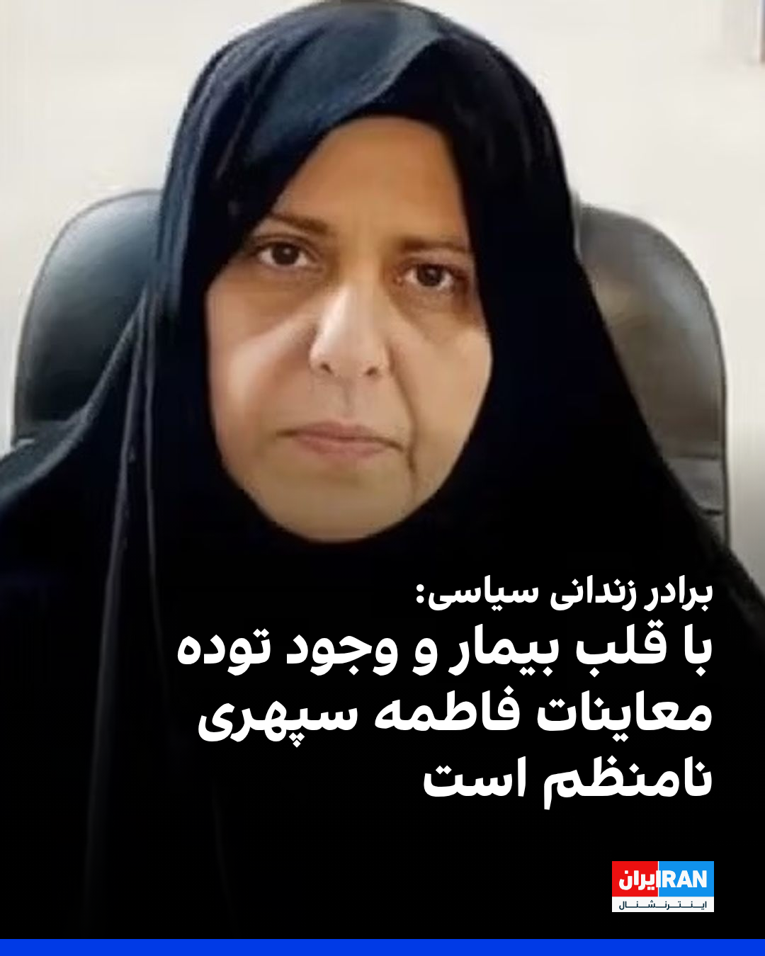 اصغر سپهری، برادر فاطمه سپهری، زندانی سیاسی محبوس در زندان وکیلآباد مشهد، در گزارش تازهای از وضعیت خواهرش نوشت با وجود بیماری قلبی و وجود توده در قفسه سینه، او هیچ برنامه درمانی منظمی ندارد و انتقال او به پزشکان متخصص با تأخیرهای طولانی انجام میشود.