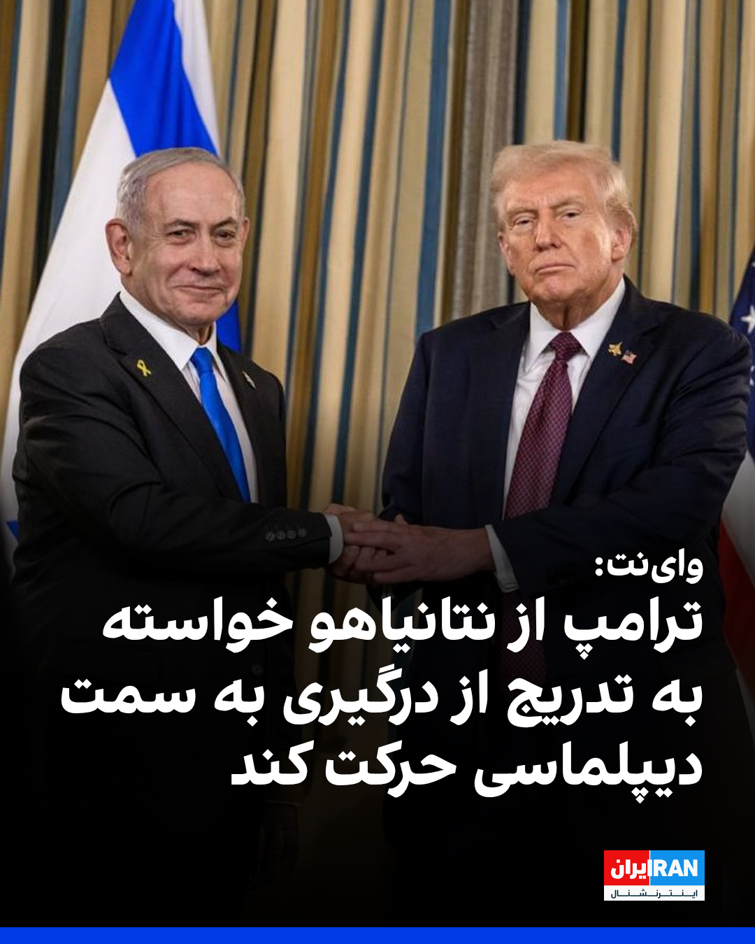 واینت گزارش داد دونالد ترامپ، رییسجمهوری آمریکا، به بنیامین نتانیاهو، نخستوزیر اسرائیل، توصیه کرده بهتدریج در غزه، لبنان و سوریه از درگیری به سمت دیپلماسی حرکت کند؛ ارتش اسرائیل نیز از نتانیاهو خواسته با دستیابی به اهدافش در ایران و منطقه، دیپلماسی را در اولویت قرار دهد.