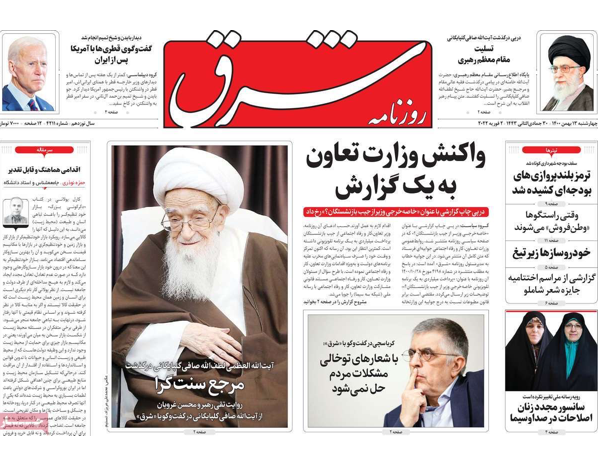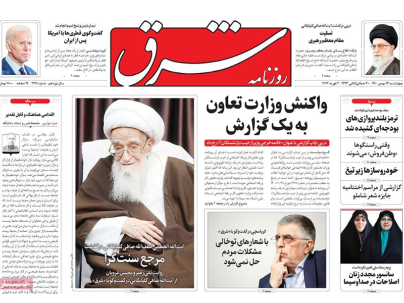 اختلفت ردود فعل الصحف الإيرانية الصادرة اليوم، الأربعاء 2 فبراير (شباط)، على وفاة مرجع التقليد الإيراني لطف الله صافي كلبايكاني ما بين معدد لمناقبه ووصفه بـ"شيخ المراجع"، و"حافظ استقلال الحوزة العلمية"، ومتجاهل لوفاته.