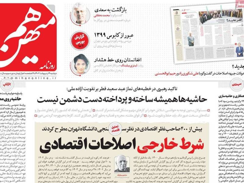 صحيفة "هم ميهن" علقت على الوضع الاقتصادي والعزلة الدولية التي تعيشها البلاد ولفتت إلى استطلاع رأي أجرته جامعة طهران مؤخرا خلص إلى أن مشكلة إيران الرئيسية تتمثل في تدهور علاقاتها الخارجية وعزلتها الدولية، مؤكدا أن أي إصلاح لا بد وأن يمر أولا من إصلاح علاقات طهران مع الدول الأخرى.