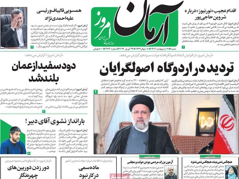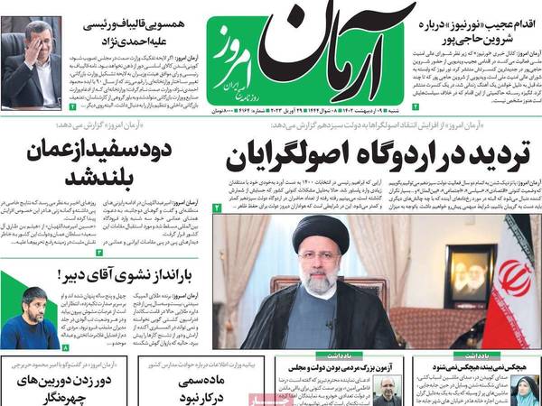 كما عنونت صحيفة "آرمان امروز" في مانشيت اليوم، وكتبت بخط عريض: "تردد وشكوك في معسكر الأصوليين"، وأشارت إلى تزايد الانتقادات لحكومة رئيسي وفشلها في تحقيق الوعود البراقة التي أطلقها الرئيس الحالي قبل استلامه للحكم منذ عامين.
