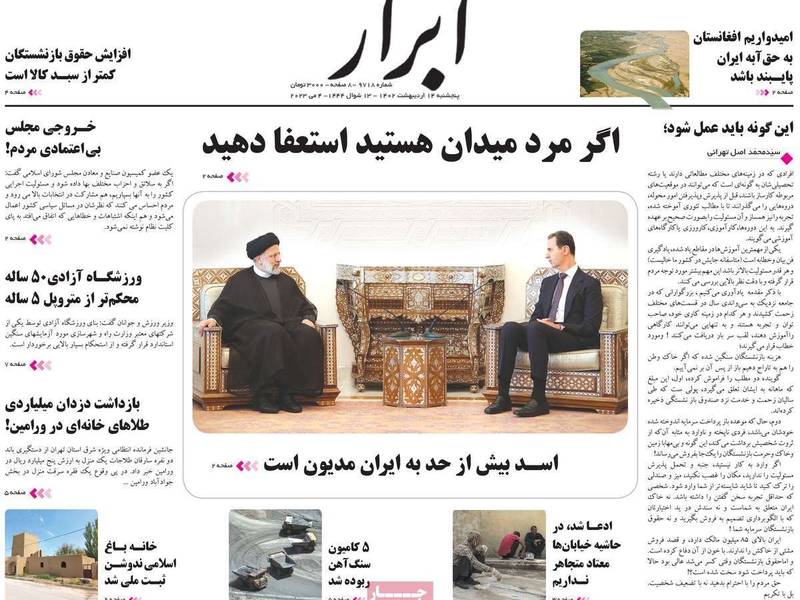 عناوين الصحف الأصولية والمقربة من الحكومة حول الزيارة كانت لافتة اليوم، فصحيفة "جام جم" كتبت بخط عريض، وقالت: "والآن حان وقت جني ثمار المقاومة"، فيما كان مانشيت "كيهان": "فصل جديد من العلاقات الاقتصادية بين طهران ودمشق بعد التوقيع على 15 مذكرة تفاهم"، وكتبت "خراسان": "يد غنية في الشام".