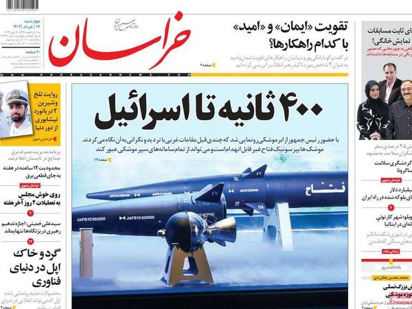 الصحف المقربة من النظام تفننت في عناوينها حول الموضوع- الذي سيكون كفيلا لتصاعد الخلافات مع الغرب- وعنونت صحيفة "كيهان" على سبيل المثال بـ"400 ثانية حتى إسرائيل"، ونقلت "خراسان" كلام المسؤولين العسكريين الإيرانيين الذين زعموا أنه لا توجد منظومة دفاع جوي قادرة على التصدي للصاروخ الإيراني الجديد. أما "جوان"، المقربة من الحرس الثوري، فعنونت في المانشيت بـ"المدمر وغير الصبور"، في إشارة إلى فاعلية الصاروخ وسرعته في الوصول إلى أهدافه، كما ذهبت صحف أخرى إلى أن الصاروخ هو "فتح الفتوح" في مجال القدرات العسكرية، وقالت إنه "كابوس إسرائيل الجديد".