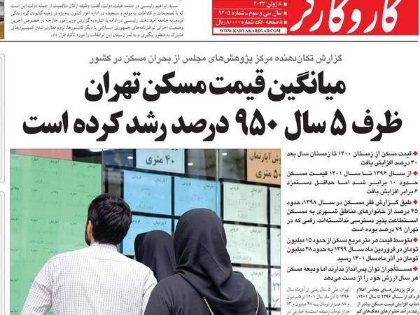 اقتصاديا أشارت صحيفة "كار وكاركر" إلى أزمة أسعار السكن في العاصمة طهران، مؤكدة أنها باتت تشكل الهاجس الأكبر للمواطنين دون وجود أي بوادر لحل الأزمة، بل بالعكس كل المؤشرات توحي بأن المستقبل سيكون أكثر سوءا وتحديا للمواطنين في طهران.