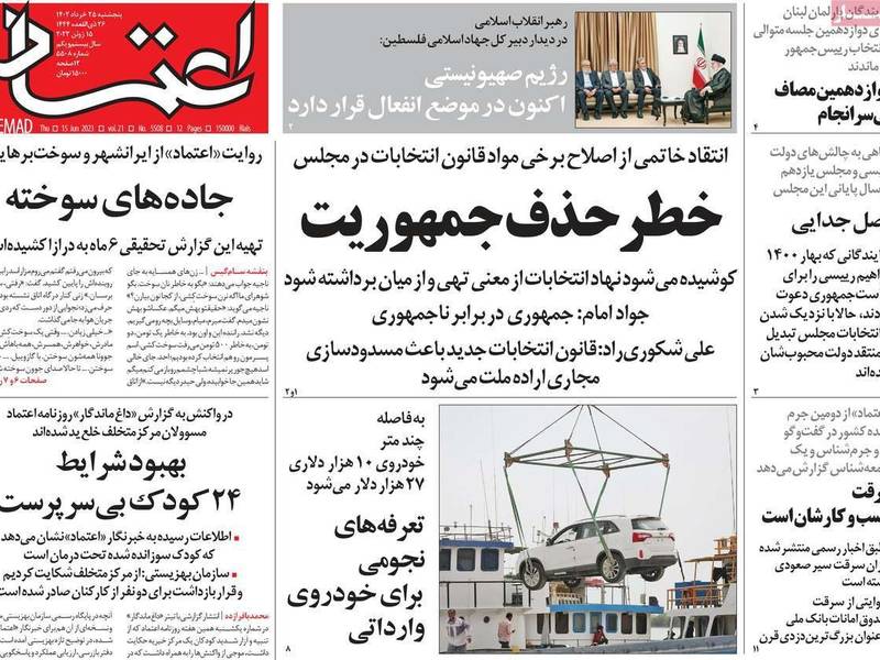 صحيفة "اعتماد" كتبت في مانشيتها اليوم الخميس 15 يونيو (حزيران): "خطر إقصاء الجمهورية"، في إشارة إلى قرار البرلمان الذي وافق على خطة تعديل قانون الانتخابات.