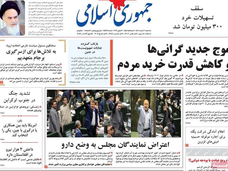صحيفة "جمهوري إسلامي" عنونت في مانشيت اليوم بـ"موجة جديدة من الغلاء وتراجع القدرة الشرائية للمواطنين"، وقالت إنه على الرغم من إطلاق تسمية "السيطرة على التضخم" على العام الجديد من قبل المرشد خامنئي إلا أننا نلاحظ في الفترة الأخيرة ارتفاعا جديدا في السلع، وهو ما يقلل باستمرار من قدرة المواطنين على الشراء وتلبية حاجتهم الأساسية.