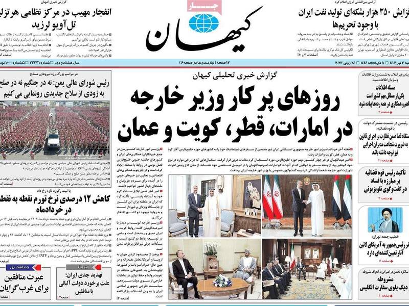 وفي سياق منفصل أشارت صحيفة "كيهان" إلى الجولة الخارجية التي أجراها وزير خارجية إيران، حسين أمير عبداللهيان، إلى عدد من دول المنطقة مثل الإمارات وقطر والكويت وسلطنة عمان وعنونت في مانشيتها حول الموضوع بالقول: "أيام مزدحمة لوزير الخارجية في الإمارات وقطر والكويت وعمان"، واصفة الاستقبال والحفاوة التي حظي بها في هذه الزيارات بـ"غير المسبوقة".
