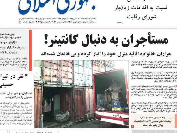 وفي شأن اقتصادي يعكس حجم الأزمة، أشارت صحيفة "جمهوري إسلامي" إلى تنامي ظاهرة تخزين الأثاث المنزلي في حاويات كبيرة بالقرب من طهران بعد أن أصبح كثير من المواطنين بلا مسكن على خلفية الارتفاع الرهيب في أسعار الإيجارات واضطرار كثير من العوائل إلى وضع أغراضهم المنزلية في مستودعات للحفاظ عليها بعد أن قرروا العيش في منازل أصغر حجما أو اضطروا إلى ترك العاصمة طهران والهجرة إلى أريافها.