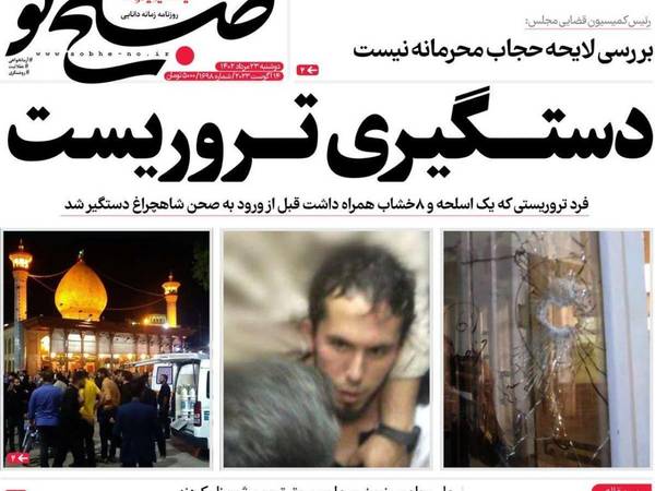 الصحف الصادرة اليوم الاثنين خصصت جلها عناوين لهذا الموضوع واكتفت بنقل رواية النظام عما جرى في الحادثة يوم أمس ولم تبرز الشكوك والتساؤلات التي يذكرها البعض حول سبب استهداف هذا الضريح حصرا ودلالات توقيت الهجوم وتداعياته. واتهم البعض النظام بالوقوف وراء هذه الهجمات لشغل الشارع وإدارة الاحتجاجات المحتملة في الأشهر القادمة بالتزامن مع مرور الذكرى السنوية الأولى لمقتل مهسا أميني.