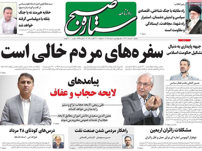 وفي سیاق اقتصادي، سلطت صحيفة "ستاره صبح" الضوء على استمرار التدهور المعيشي في إيران في ظل تخبط سياسات الحكومة، ونقلت عن الخبراء قولهم إن سياسات حكومة رئيسي منذ مجيئها كانت خاطئة وهو ما ضاعف الأسعار وجعل التضخم يشهد نسبا غير مسبوقة في تاريخ البلاد.