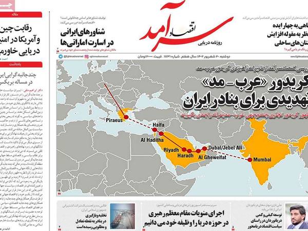 صحيفة "خراسان" الأصولية، قالت إن إيران هي الخاسر الرئيسي من هذه الممر، وحتى ممر طريق الحرير الذي تعمل عليه الصين، مؤكدة أن طهران "متخلفة عن ركب الدول المتنافسة في هذه الممرات".