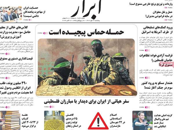 صحيفة "جوان"، المقربة من الحرس الثوري، هي الأخرى سلكت نهج الوعيد والتهديد واستخدمت في عنوانها الرئيسي: "سندمر نصف جيش إسرائيل"، وقالت إنه وفي حال قررت تل أبيب الدخول بريا إلى غزة فهذا يعني كارثة بالنسبة للجيش الإسرائيلي، إذ إن الفصائل الفلسطينية في قطاع غزة تنتظر مثل هذه الفرصة لتحميل إسرائيل ضربة غير مسبوقة.
