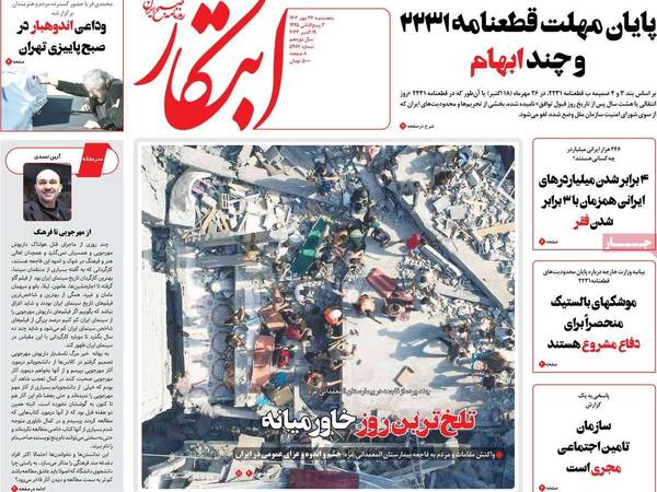 كما نقلت صحيفة "سياست روز" كلام الرئيس الإيراني إبراهيم رئيسي خلال مسيرة تضامنية مع غزة في طهران، والذي قال فيها إن "نهاية الاحتلال الصهيوني قد اقتربت"، وعنونت الصحيفة في المانشيت: "مستعدون للحرب".