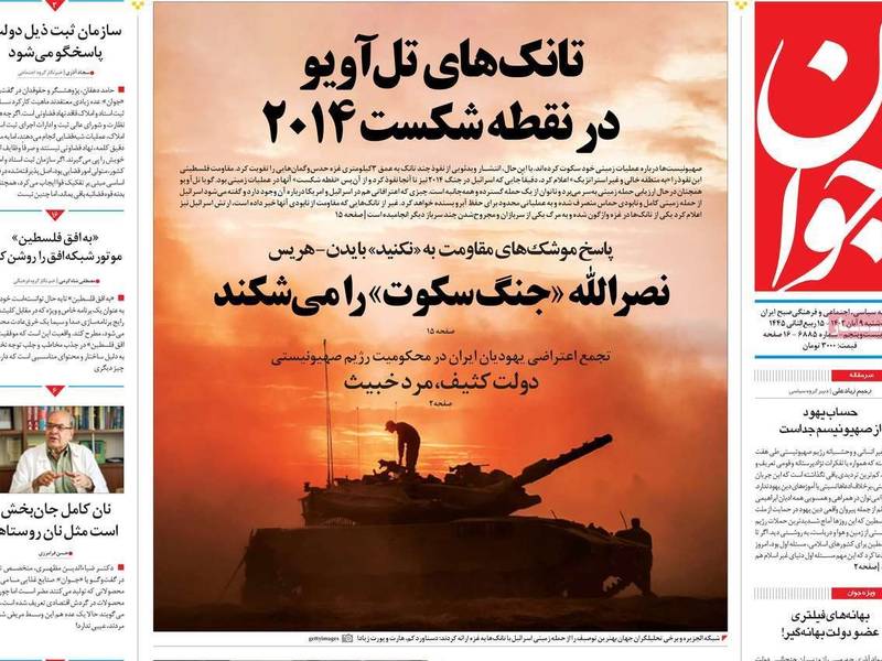 أما صحيفة "جوان"، المقربة من الحرس الثوري الإيراني، فيبدو أنها ترغب في توسيع الحرب في غزة، وتوريط لبنان مع اسرائيل وذلك عبر عنوان عريض على صفحتها الأولى: "نصرالله سيكسر صمت الحرب"، مشيرة إلى كلمة أمين عام حزب الله اللبناني المقررة يوم الجمعة المقبل.