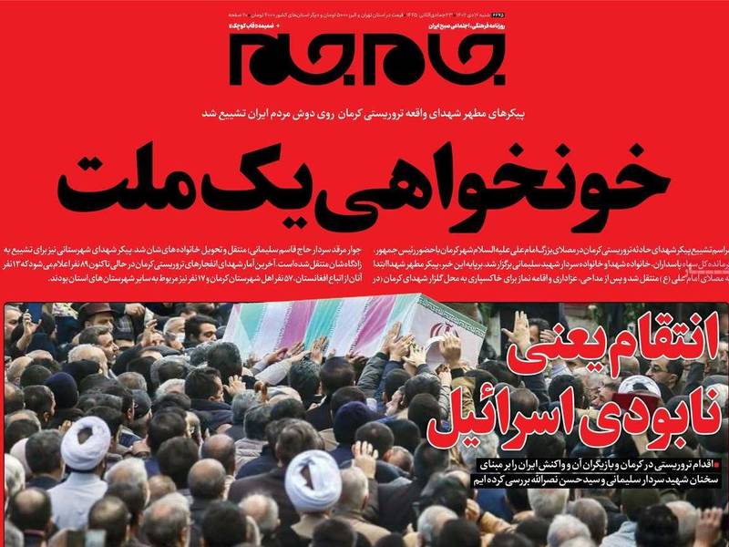 قالت صحيفة "هم ميهن" الإصلاحية إن الهدف الرئيسي من انفجارات كرمان هو إظهار عجز السلطات والأجهزة الأمنية والاستخباراتية للنظام الإيراني في توفير الأمن للمواطنين.