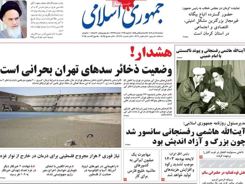 وفي سياق منفصل علقت صحيفة "آفتاب يزد" على أزمة المياه، والتقارير التي تحذر من موسم جفاف جديد في إيران، وعنونت في صفحتها الأولى بالقول: "كابوس شح المياه"، وتوجهت بسؤال إلى المسؤولين بالقول: "ماذا أعددتم لأزمة شح المياه في فصل الصيف القادم؟".