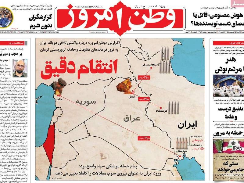 اختلفت رواية صحف النظام الصادرة اليوم، الأربعاء 17 يناير (كانون الثاني)، في تعاطيها مع الهجمات الصاروخية التي نفذها الحرس الثوري الإيراني مساء الاثنين على أهداف في سوريا والعراق.